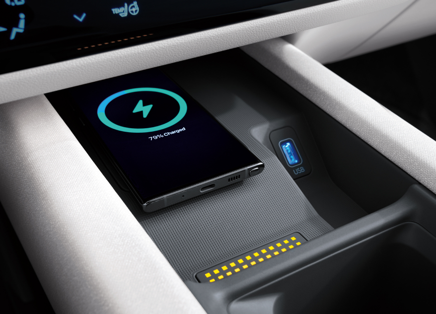 Архитектура интерьера IONIQ 6, ориентированная на пользователя, делает его практичным и удобным рабочим пространством, где идеи могут стать реальностью. Центральная консоль мостового типа предназначена для размещения ноутбука и оснащена двумя портами USB-C и одним портом USB-A для питания различных устройств. Под сиденьями второго ряда вы также найдете традиционную розетку — вилку V2L.