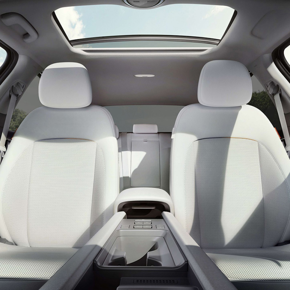 Внутреннее пространство IONIQ 6 в форме кокона представляет собой куполообразный салон, разработанный для комфорта и практичности — это личное убежище, похожее на укромный кокон.